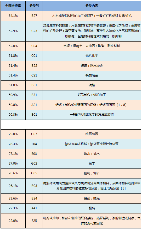 总体上看,无机材料(如木材、金属、水泥等)及其加工(如镀覆、表面处理等)等较为基础的领域无效请求的全部维持率相对较高;而光电等的具体应用领域无效请求的全部维持率相对较低。