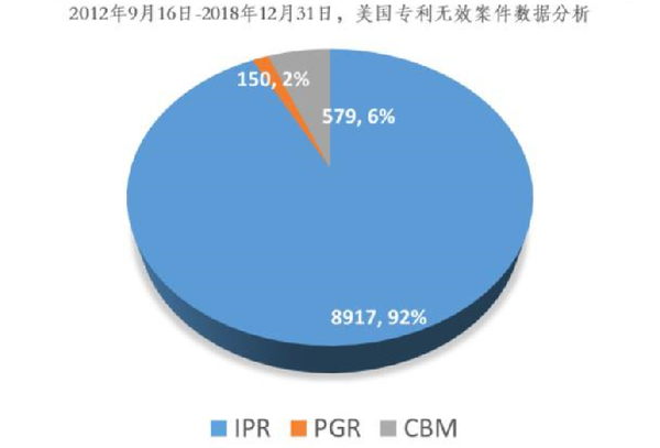 5、根据USPTO(美国专利商标局)公布的2012年9月16日至2018年12月31日美国专利无效案件数据,在IPR、PGR、CBMR三种无效(复议)程序中,IPR占比最多,高达92%,合计为8917件;IPR较少,占比仅为2%,合计150件。从目前的数据观察,IPR是上述三种无效(复议)程序中最受欢迎的方式。